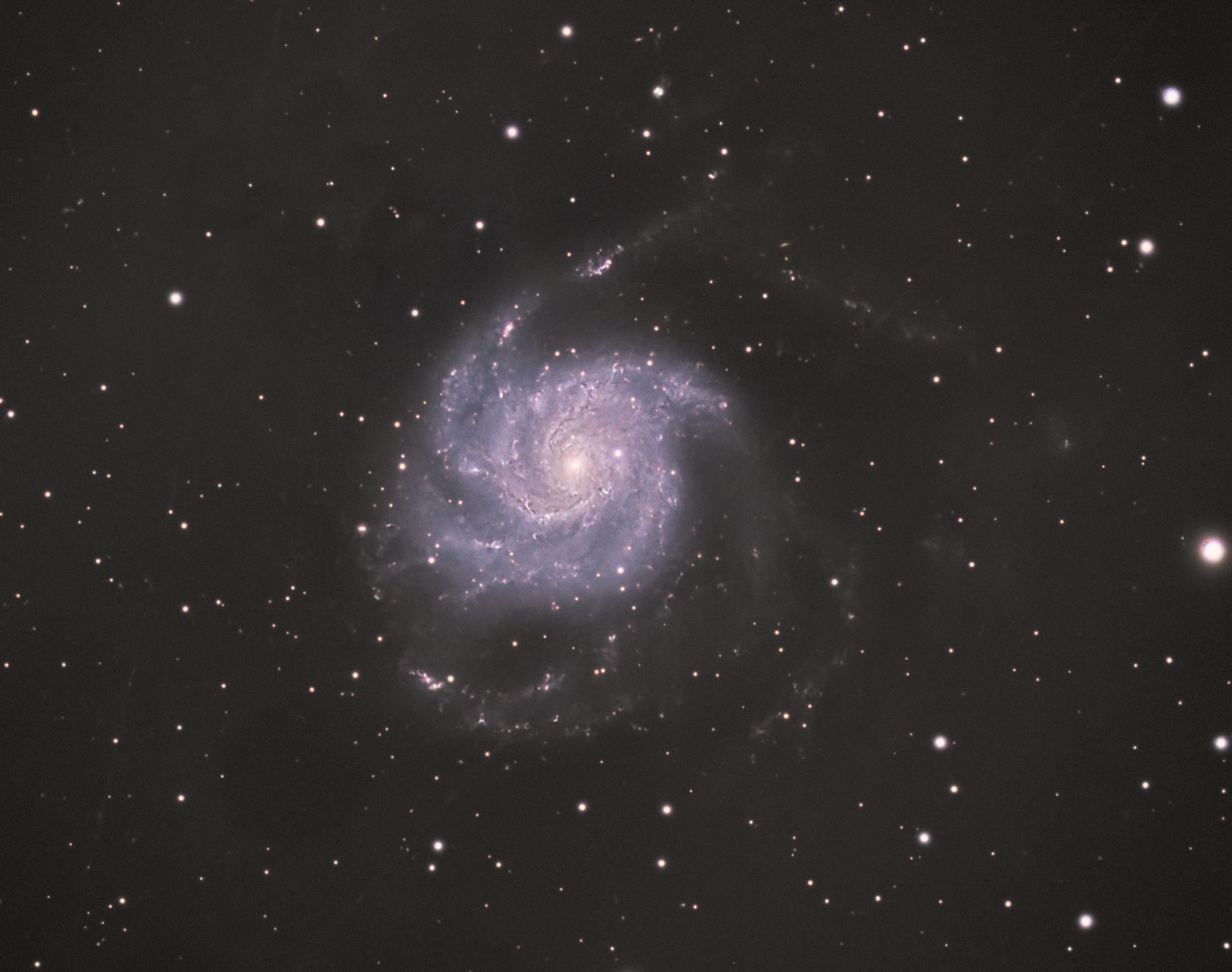 Exposure time: 5 hours, 15 minutes (LRGB 5 min. subs, 16:16:15:16) | Optics: Explore Scientific ED APO 102 f/7 | Camera: Altair Astro 26MM (gain 100) | Mount: iOptron Cem40 | SQM: 19.3 magnitude/arcsec² | Location: Haarlem, Netherlands | Date: April/May 2025 | Pinwheel Galaxie